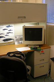 和很多亞洲(好吧,說穿了就中國和印度:P)的研究生共用,大部分都是博士生。基本配備是書桌和書架隔出來的個人空間+速度不快但是有寬頻網路的電腦一台。大部分的時間我都呆在一樓的辦公室裡唸書,雖然三不五時要和坐後面的Prady學長聊天一下,但是總比呆在研究室要隨時準備跟老闆哈啦輕鬆一點點XD。